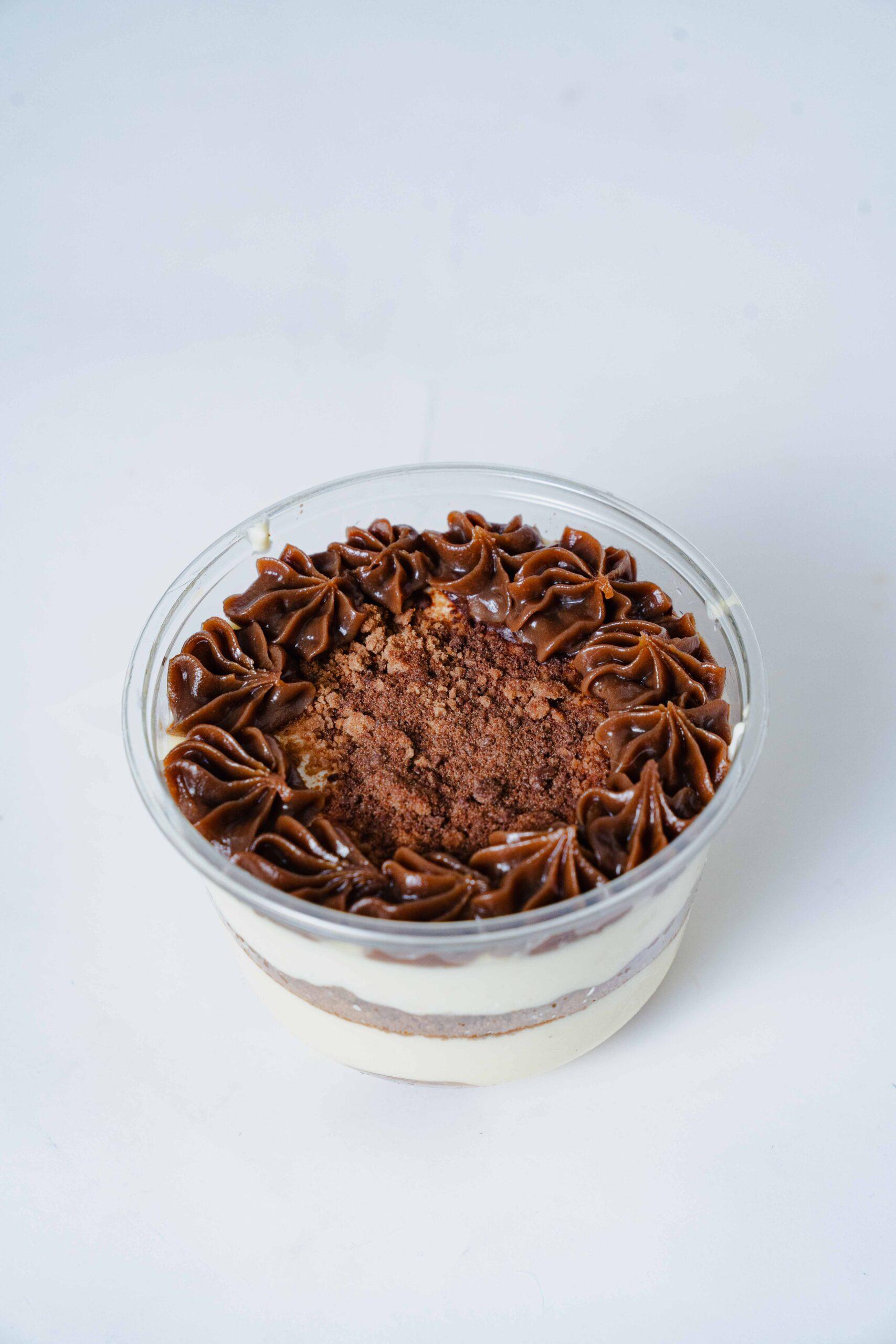 Capas de bizcocho rellenas de crema inglesa, con salsa de mora