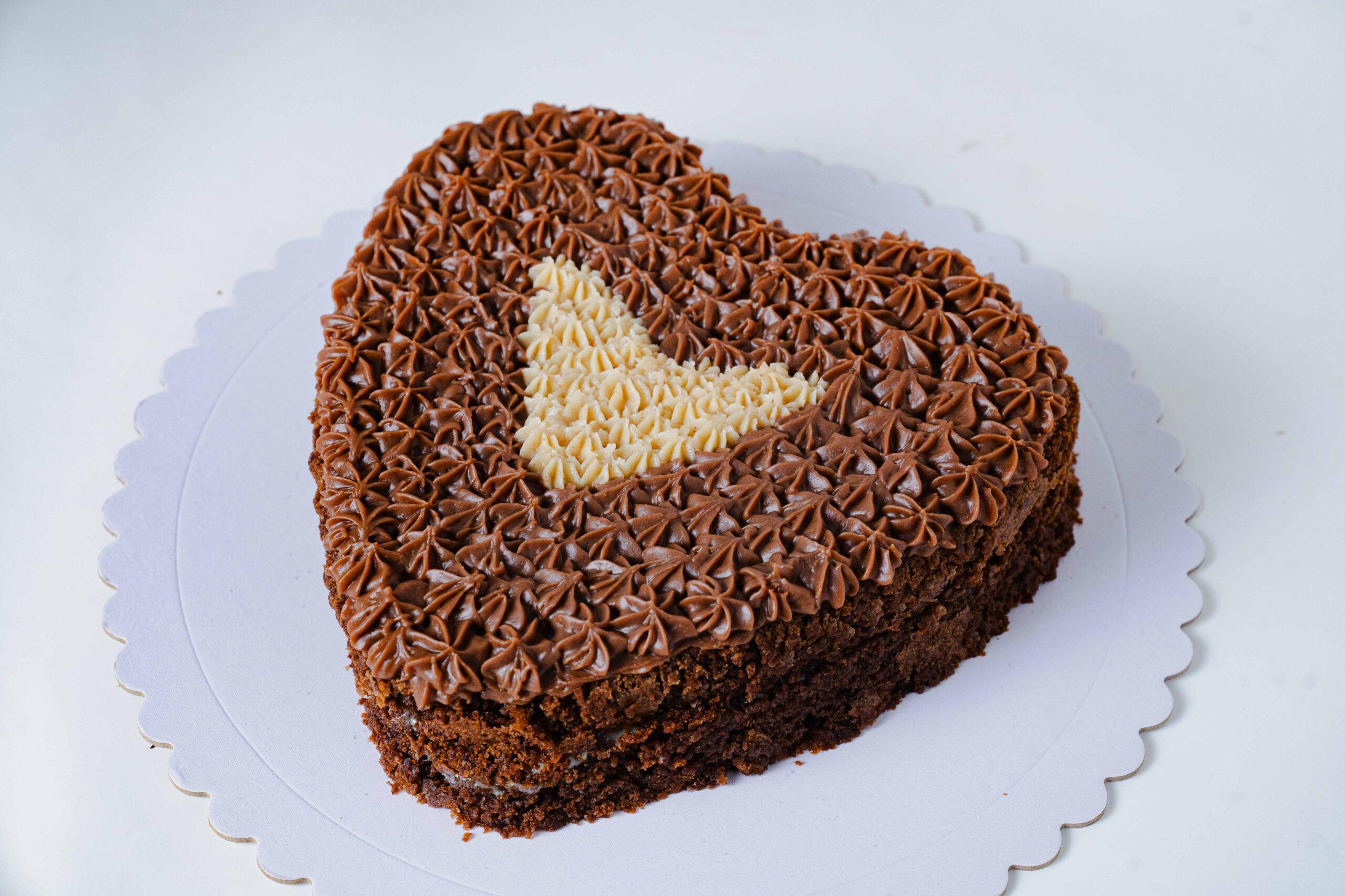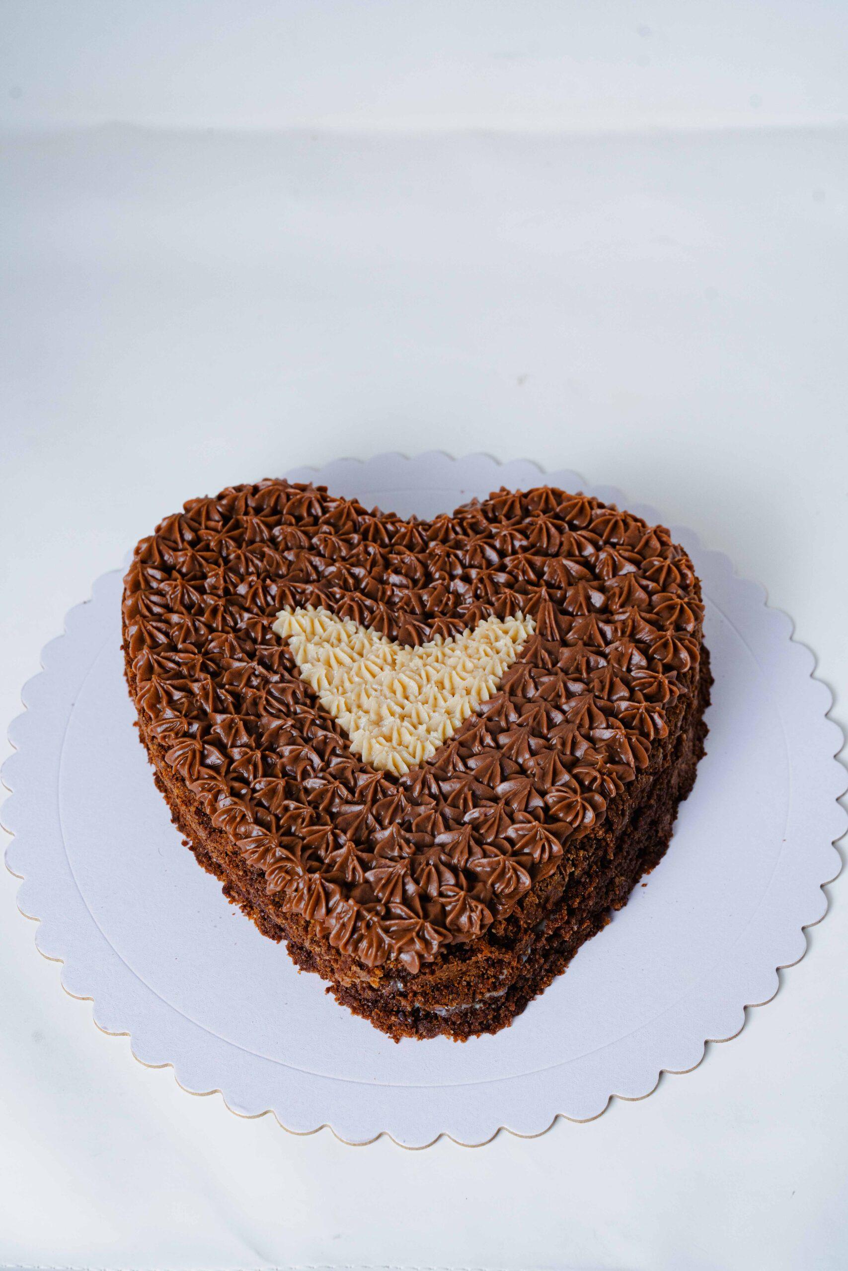 Torta de chocolate en forma de corazón rellena de manjar casero y con topping de brigadeiro de Milo y nuez
