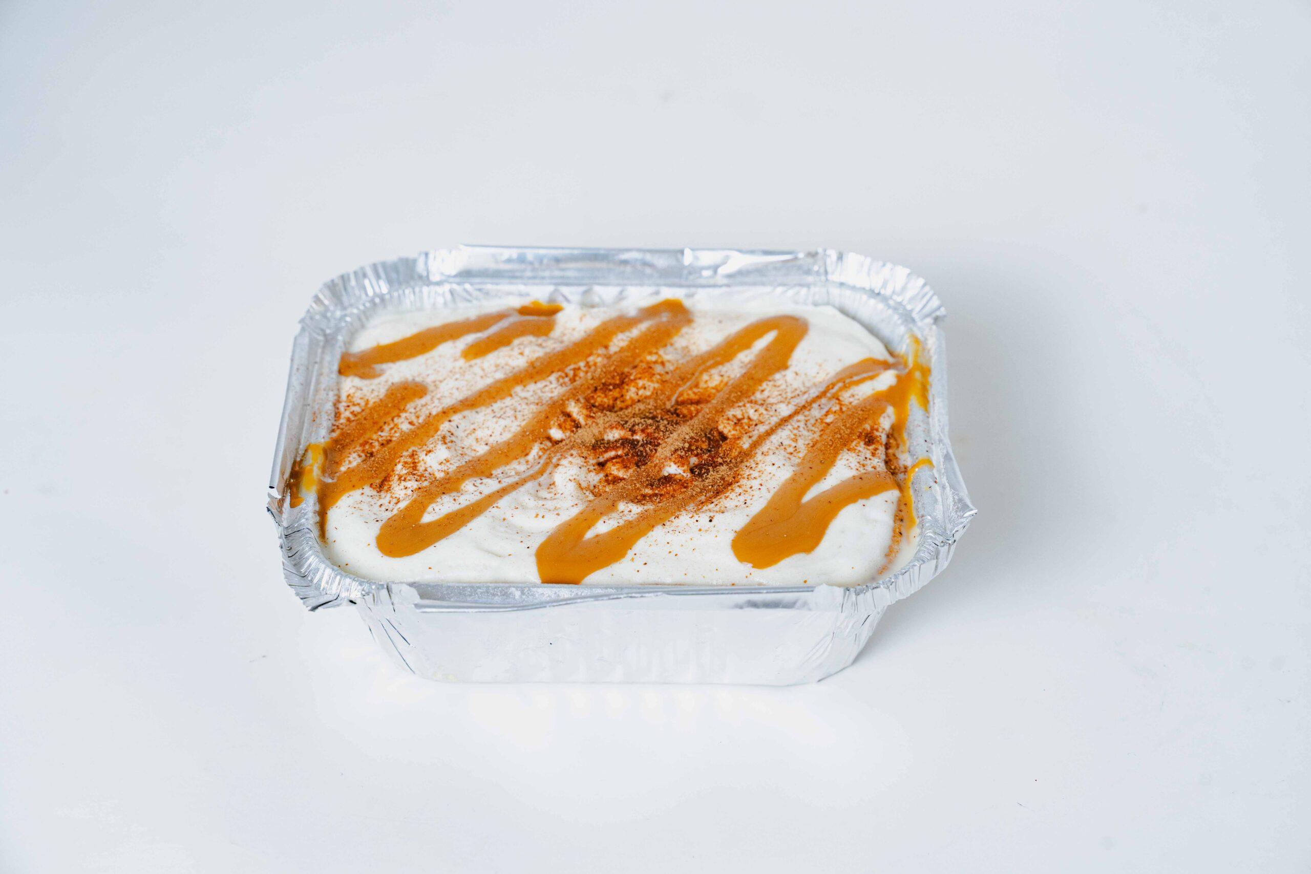Bizcocho mojado con crema a base de tres leches, con frosting de crema chantilly, manjar y canela espolvoreada